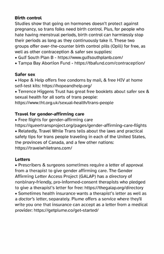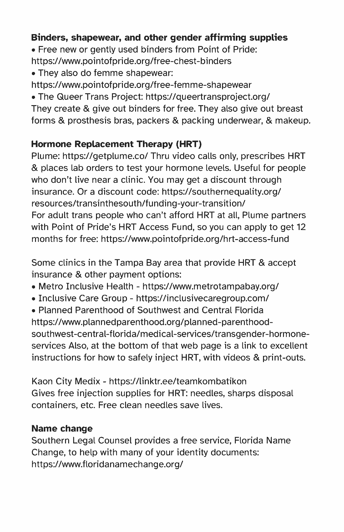 This zine is a directory of free, discounted, or funded options for transgender adults to find community and gender affirming healthcare, binders, name changes, and more. This zine has resources that are state-wide or national, but it focuses on local resources in west central Florida.